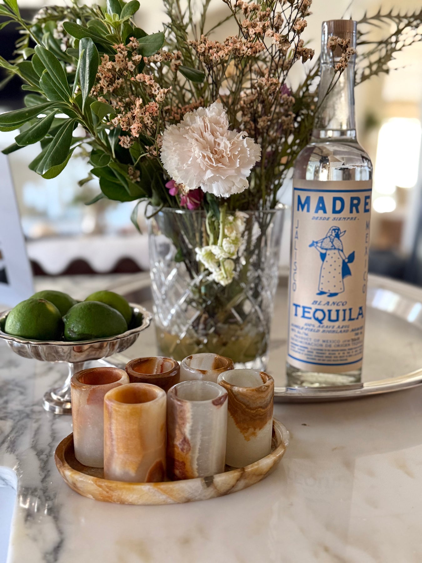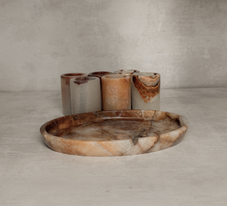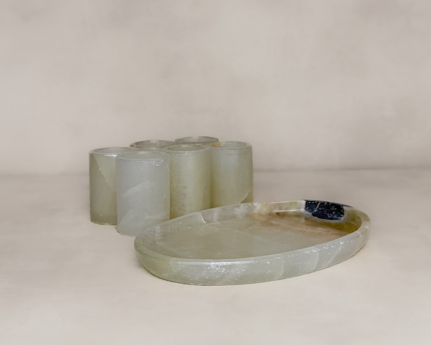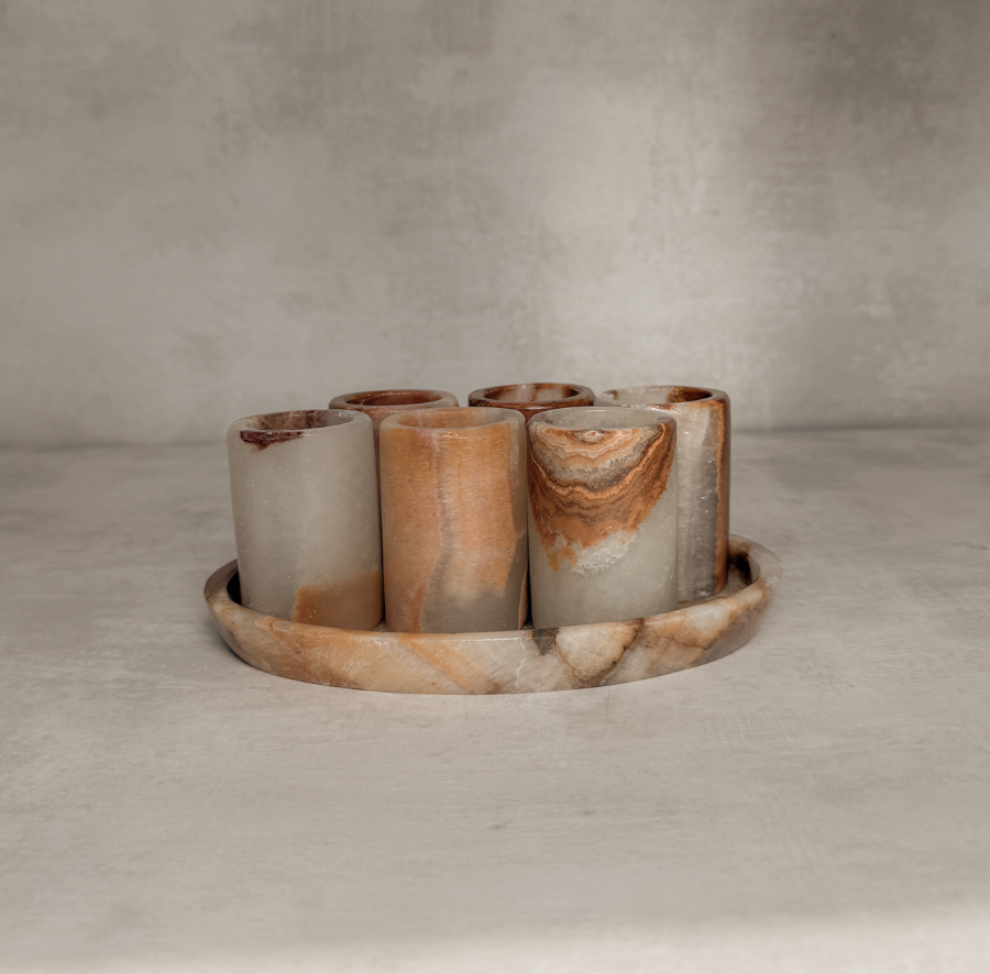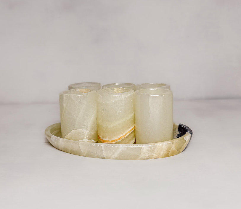 The soft hues of the onyx are accented with natural veining and organic textures—no two pieces are alike. This artisanal set is perfect for serving mezcal, tequila, or as a stunning decorative accent in your home.