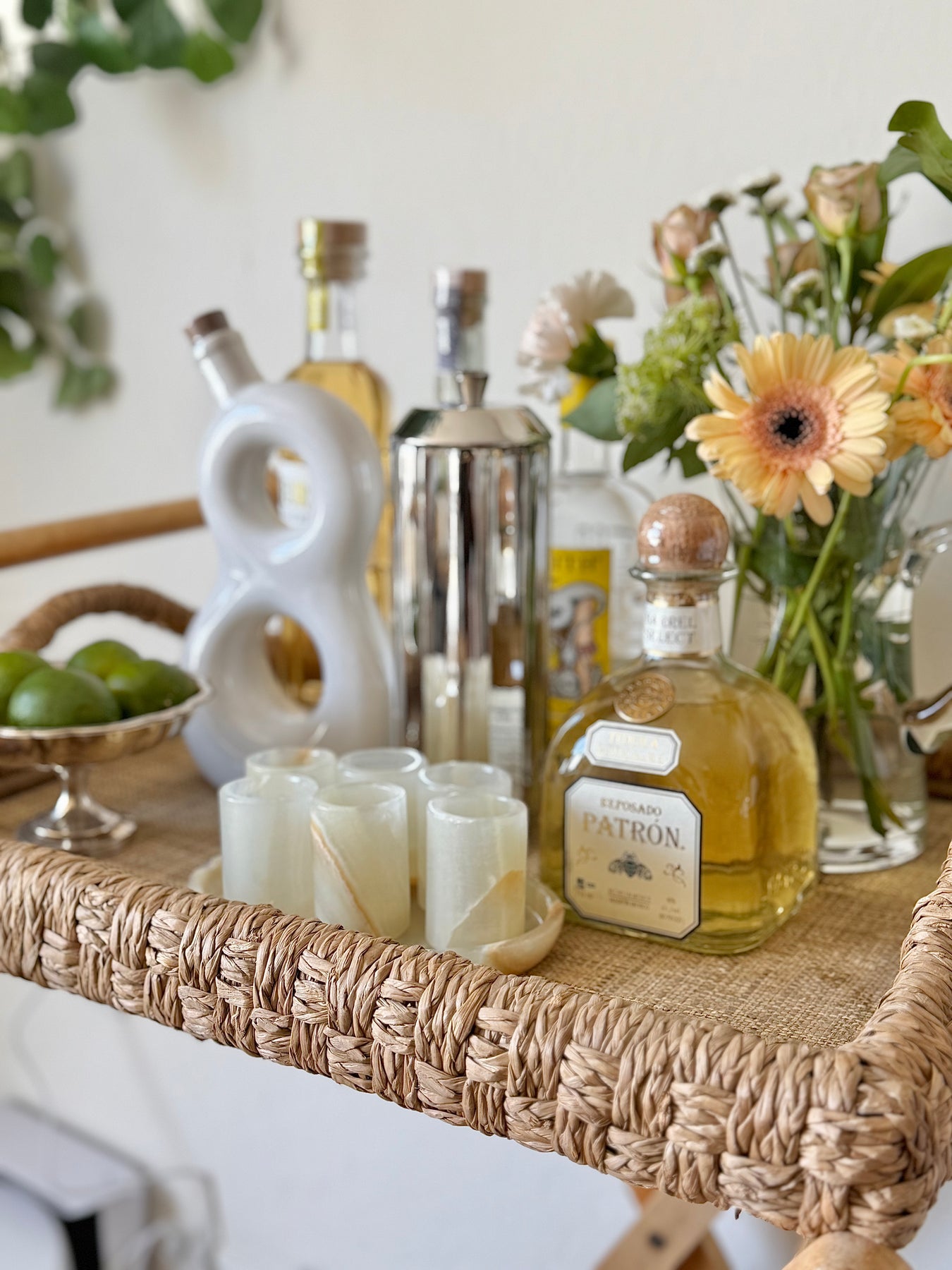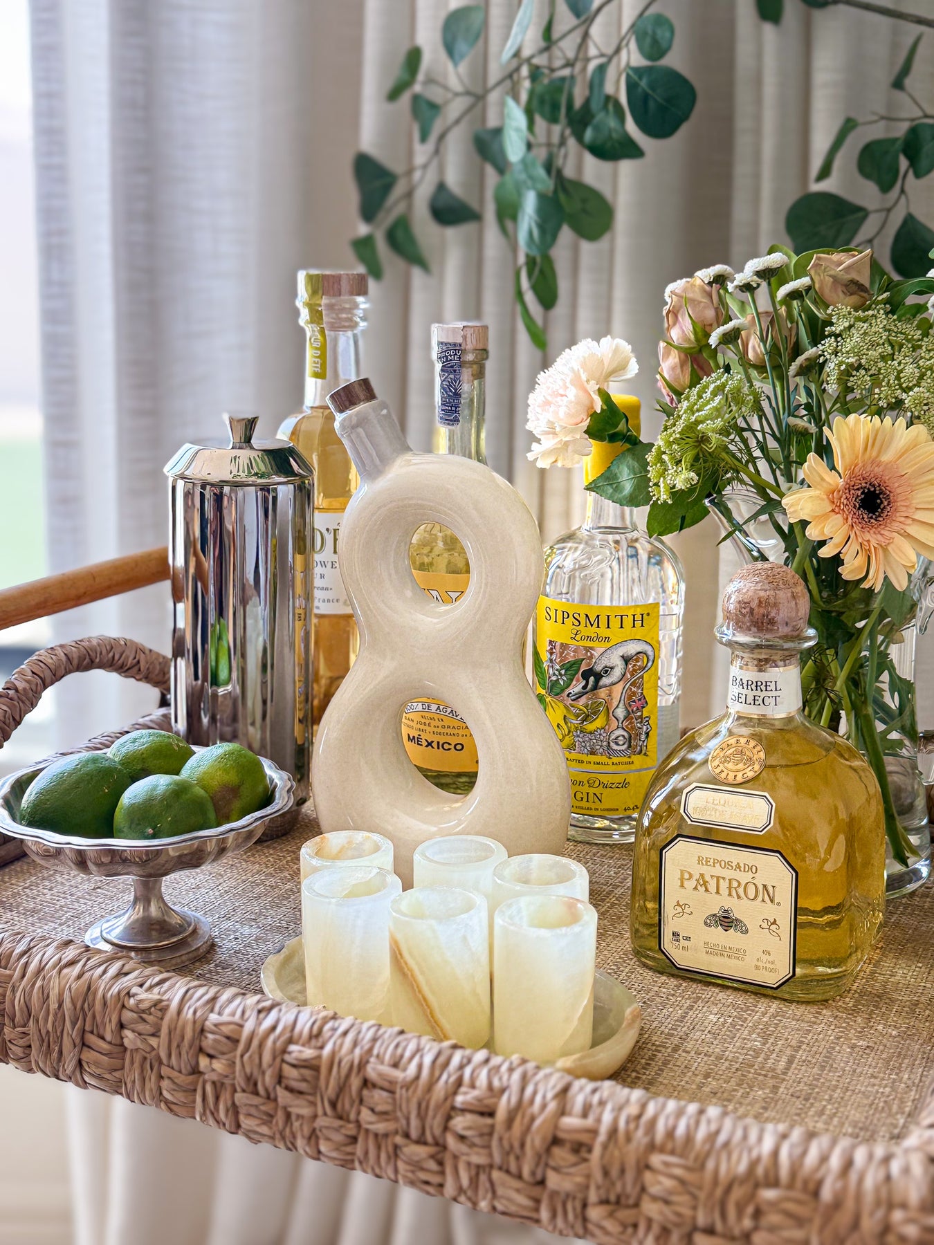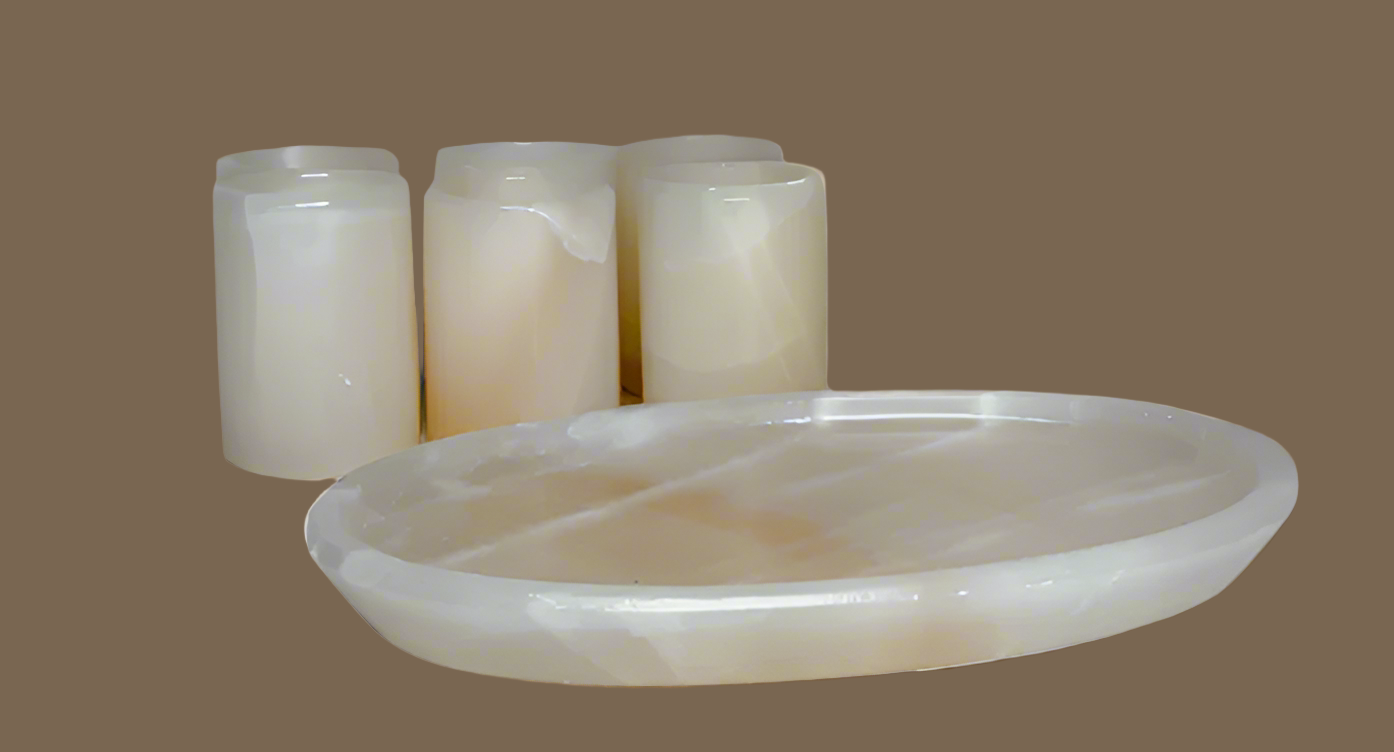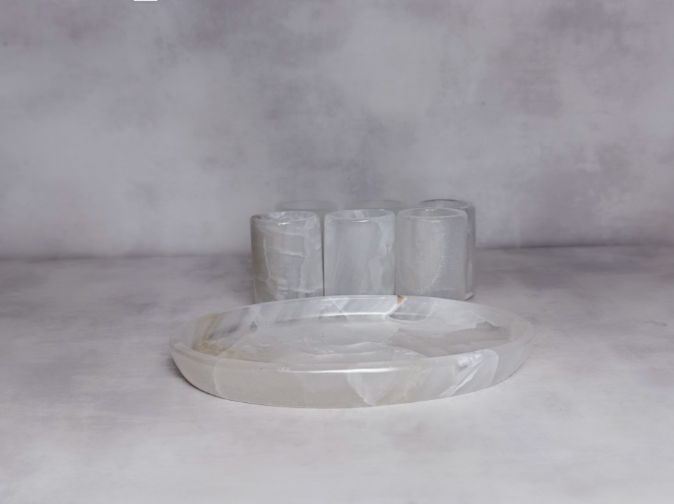 The soft hues of the onyx are accented with natural veining and organic textures—no two pieces are alike. This artisanal set is perfect for serving mezcal, tequila, or as a stunning decorative accent in your home.