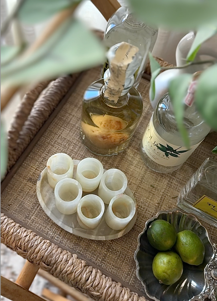 Bring the spirit of Mexico to your home with this exquisite set of handcrafted shot glasses and matching tray, made from natural  onyx. Each piece is meticulously carved by skilled artisans in Tehuacán, Mexico, a region celebrated for its deep tradition of stone craftsmanship.